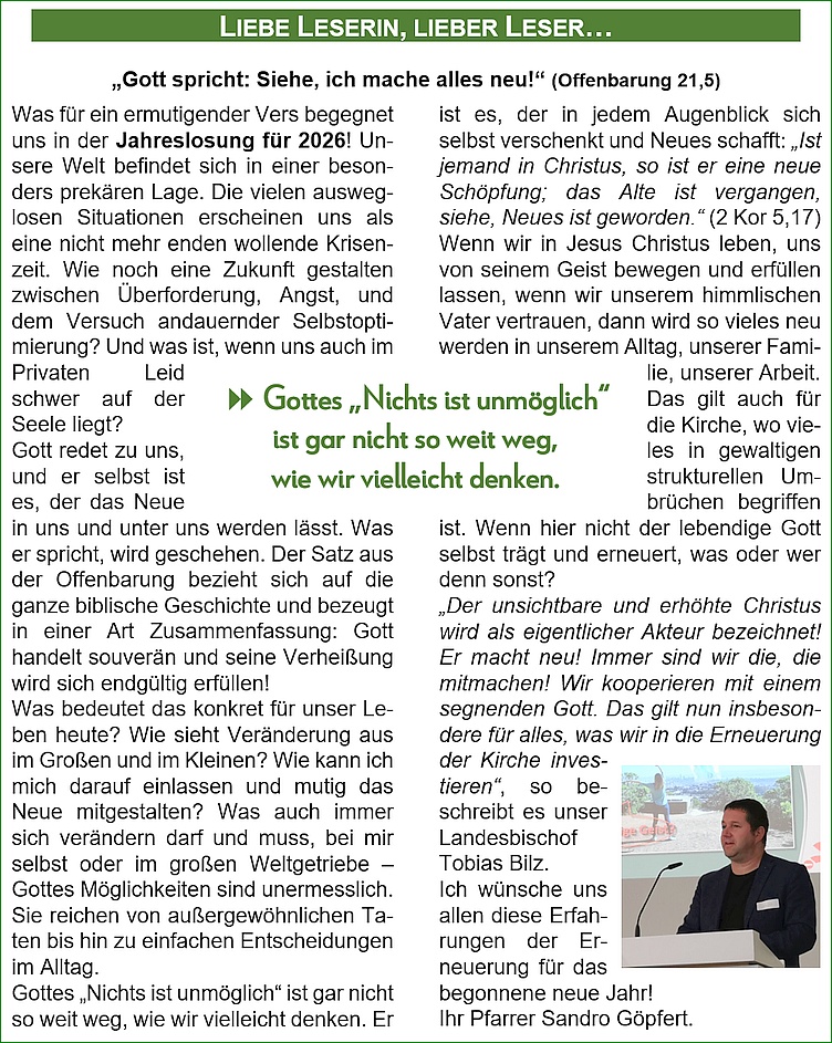 - Siehe, ich mache alles neu! - Alles wird neu, denn das Alte hat uns bis heute keinen Frieden gebracht. Die ganze Schöpfung leidet unter der Ungerechtigkeit und dem Unrecht in unserer Welt. Ich sehne mich nach dem Tag, an dem Gott alles neu macht. Allerdings glaube ich, dass er damit schon begonnen hat: Mit Jesu Kommen kam Gottes neue Welt in unsere Welt hinein. In Jesu Auferstehung wurde sichtbar, dass der Tod überwunden ist. Jeder Mensch, der an Jesus Christus glaubt, betritt die neue Welt Gottes. Dort verwandelt Gottes Geist unser Wesen Stück für Stück in das Wesen Jesu Christi. Diese Erneuerung ist für mich ein Vorbote, dass Gott am Ende wirklich alles neu machen wird. Das darf auch im kommenden Jahr unsere Zuversicht sein.