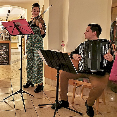 Musik mit Gwendolin & Luca, Gesang und Akkordeon (im Bild beim Lebendigen Adventskalender 2023 in Wittgensdorf)Seit 25 Jahren gibt es C-pur.