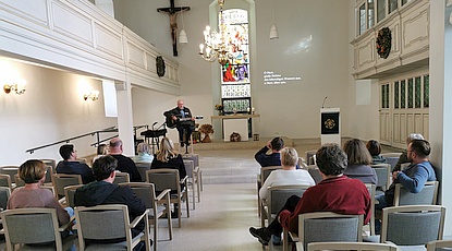 Torsten, Esther und Sandro beim thematischen Impuls und Daniel bei der Liedbegleitung.