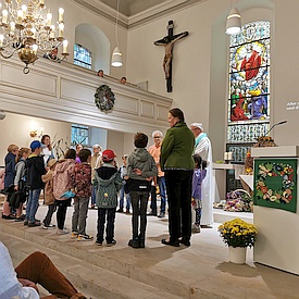- 10 Uhr Erntedankgottesdienst in einer schön geschmückten Kirche mit gewaltigen Klängen vom Posaunenchor, geleitet von Pfr. Gerald Brause (Predigt im Archiv), Lesungen mit Jana Gora und einem gut besuchten Kindergottesdienst.