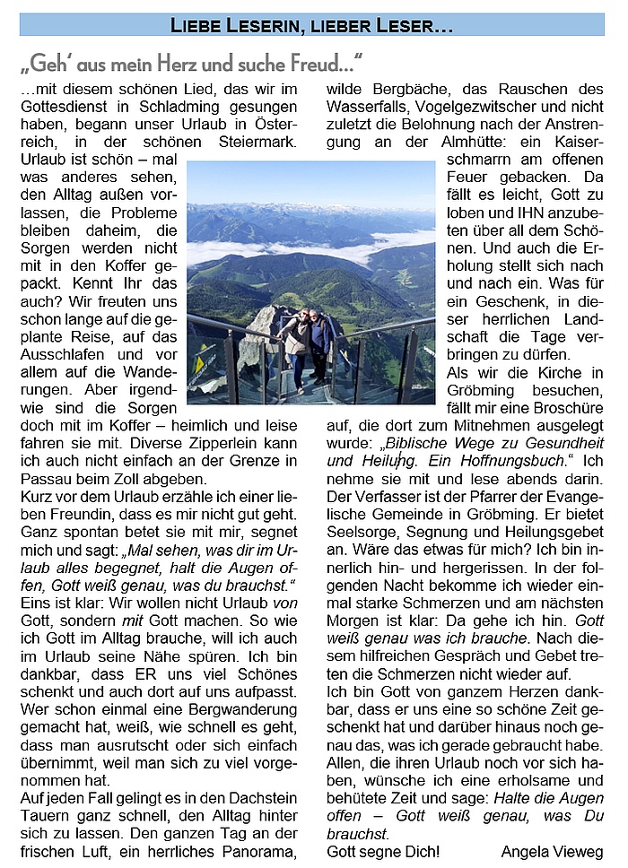 „Worte von Menschen können trösten, aufbauen und lebensstärkend wirken. Gottes Wort hat die Macht, Leben zu schaffen und Leben hervorzubringen. Gott sprach und es wurde. Gott spricht und es geschieht. Gottes Wort ist die Quelle des Lebens, aus der wir schöpfen dürfen, jeden Tag neu.“