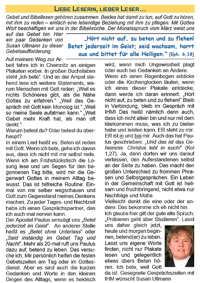 Es hat sich nun so ergeben, dass wir genau in diesen Tagen zur diesjährigen Bibelwoche einladen. Morgen im Gottesdienst wird sie eröffnet. Wollen wir es bitte nutzen als Chance zur geistlichen Gemeinschaft, gemeinsam an die Kraftquellen von Gottes Wort und miteinander ins Gebet zu gehen. Die Themen aus dem Daniel-Buch greifen in besonderer Weise auf, dass Gott da ist, Menschen ihm vertrauen können, dass ER lenkt und leitet, die Wahrheit offenbart und eingreift. Hier ist ein Flyer zur Bibelwoche.