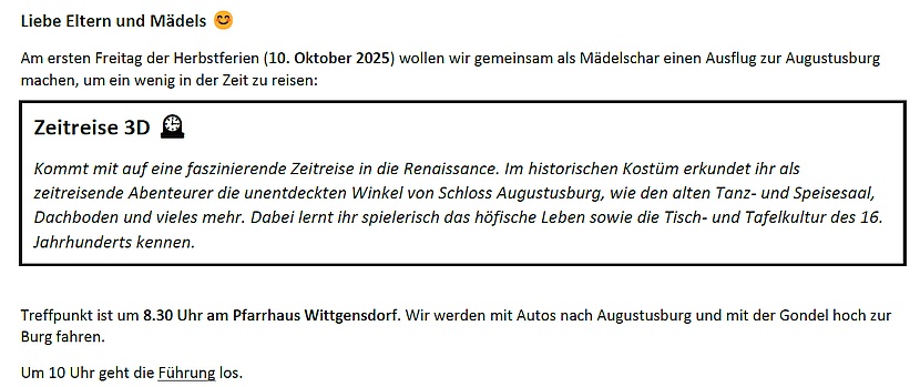 Am ersten Freitag der Herbstferien (10. Oktober 2025) wollen wir gemeinsam als Mädelschar einen Ausflug zur Augustusburg machen, um ein wenig in der Zeit zu reisen: