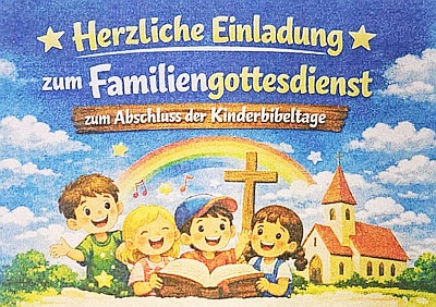 Der Familiengottesdienst heute mit reichlich gefüllter Kirche (ca. 150 Besucher) war ein guter und fröhlicher Abschluss unserer Kinderbibeltage. Wir haben gemeinsam - Kinder und Eltern, Jugendliche und viele Gäste - gesungen, gebetet, auf Gottes Wort gehört und mit Bildern und einem kleinen Video auf die Tage zurück geblickt.Vielen Dank an alle Kinder (ca. 30) für euer Kommen und an alle Mitarbeiter, die diese Tage überhaupt erst ermöglich haben.