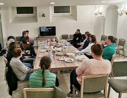 Torsten, Esther und Sandro beim thematischen Impuls und Daniel bei der Liedbegleitung.