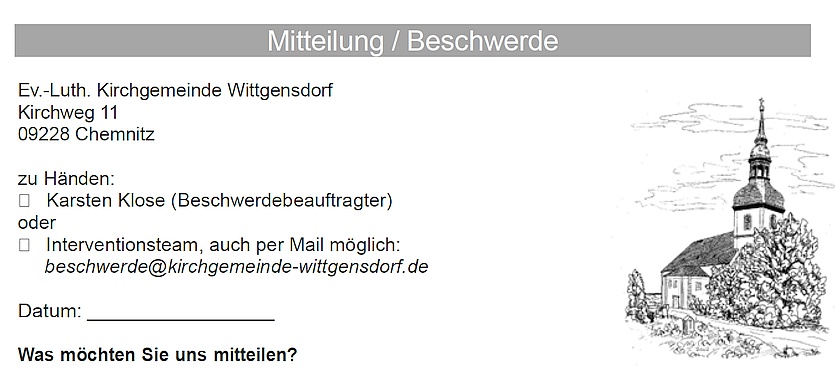 o An die Mailadresse beschwerde@kirchgemeinde-wittgensdorf.de gesendet werden - Weitergabe an die Meldestelle im Landeskirchenamt: